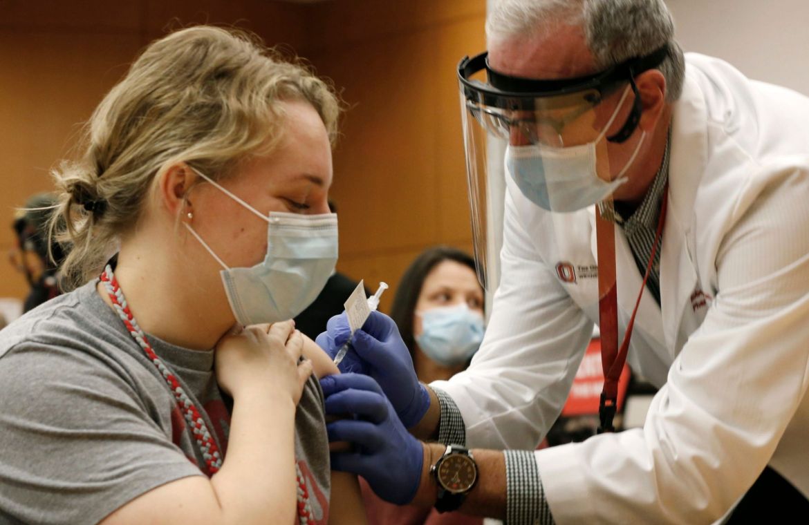 Ohio State employee Lauren Chisholm, left, receives a Pfizer-BioNTech COVID-19 vaccination from Robert Weber AP Photo/Jay LaPrete