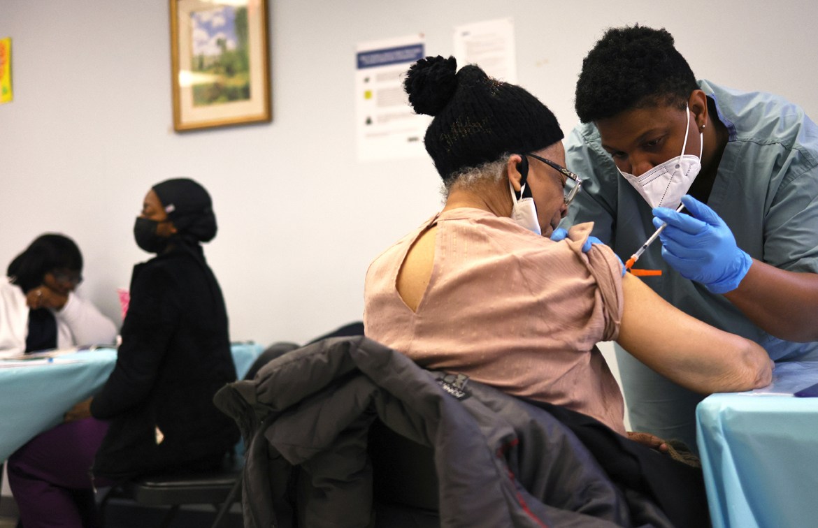 Elizabeth Griffin is given her first dose of the Moderna COVID-19 vaccine by Anya Harris at Red Hook Neighborhood Senior Center on Feb. 22 in New York City. (Michael M. Santiago/Getty Images)