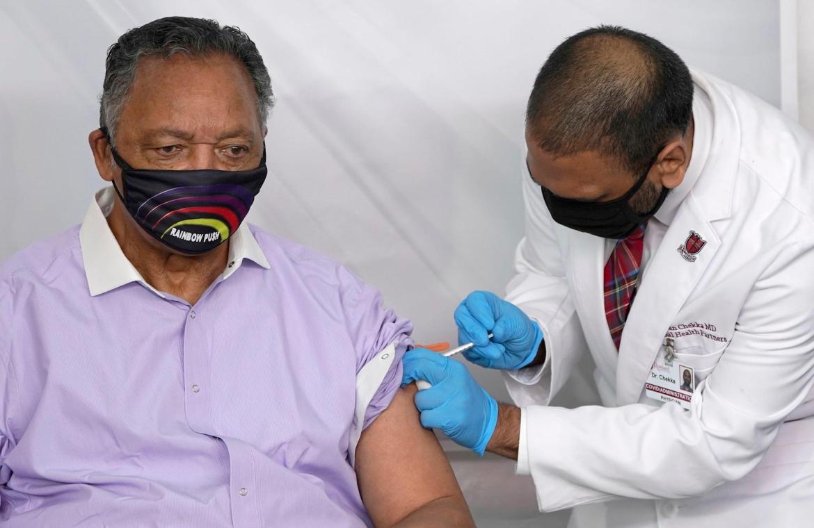 Rev. Jesse Jackson receives the Pfizer’s BioNTech COVID-19 vaccine Friday, Jan. 8, 2021, from Dr. Kiran Chekka, Covid Administration Physician on the Roseland Community Hospital in Chicago.
