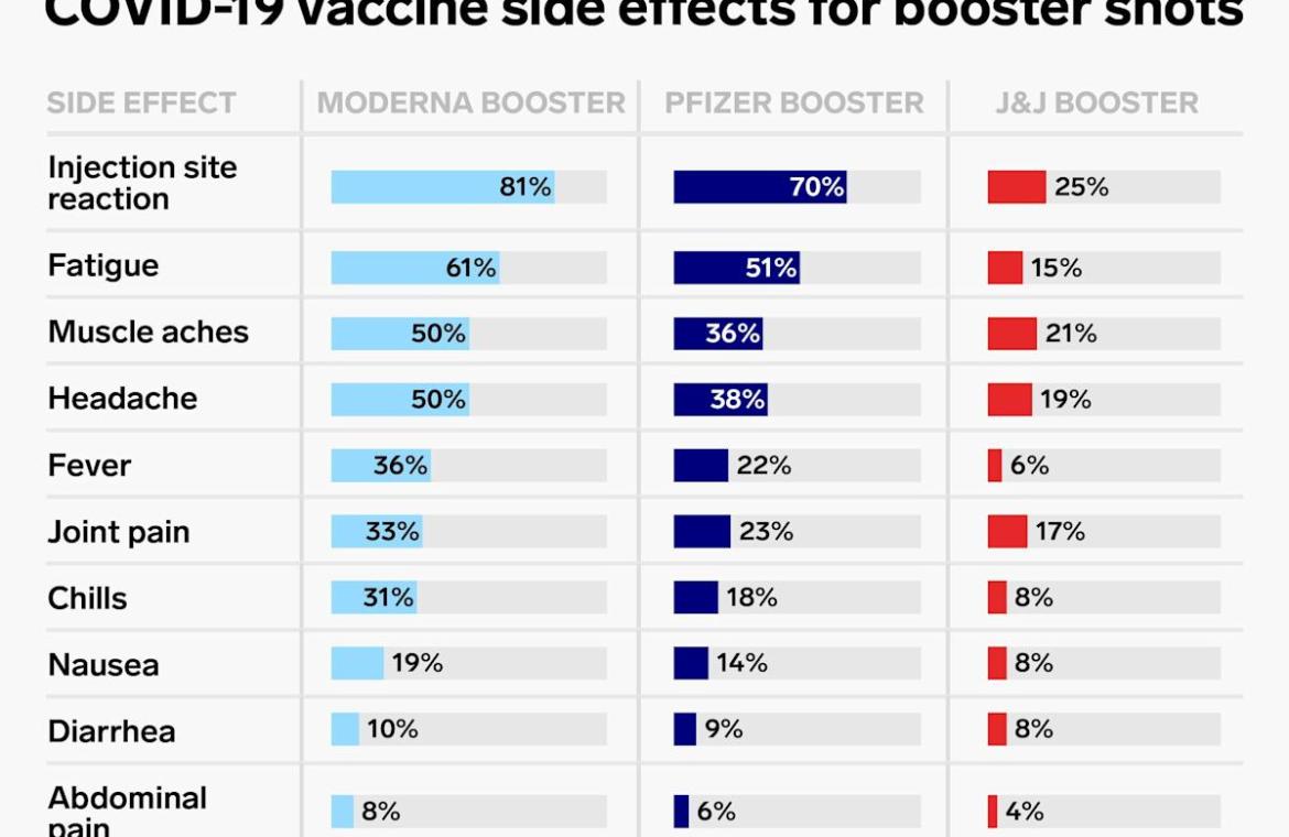 Aside from native reactions at the injection website, fatigue was most common amongst individuals who acquired a Pfizer or Moderna booster.