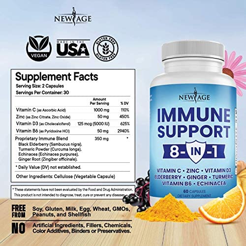 8 Powerful Immunity Ingredients –New Age has formulated the very best potent immune assist capsule packed (*120*) over 1550mg per serving of the highest 8 immunity boosting elements. Sambucus Elderberry (*120*) Turmeric and Ginger assist present antioxidant assist, Zinc citrate oxide (a necessary nutrient) helps to advertise immune perform, we’ve added Vitamin D3 5000 IU, Vitamin C, and Echinacea to carry you a robust elderberry complement nice for any season and B6 for every day power